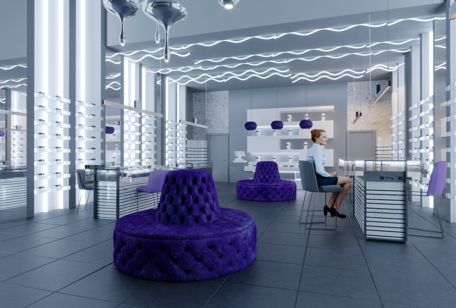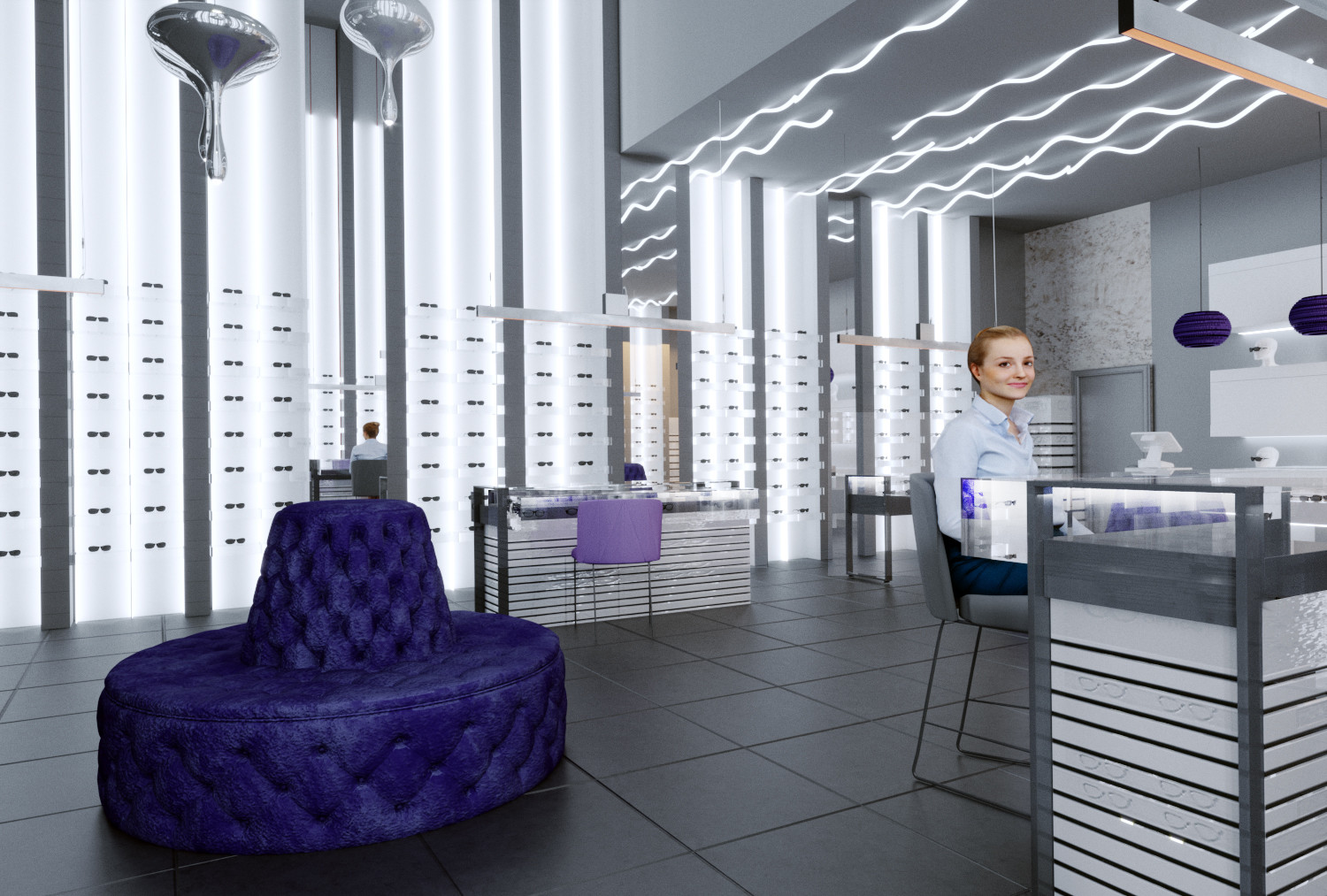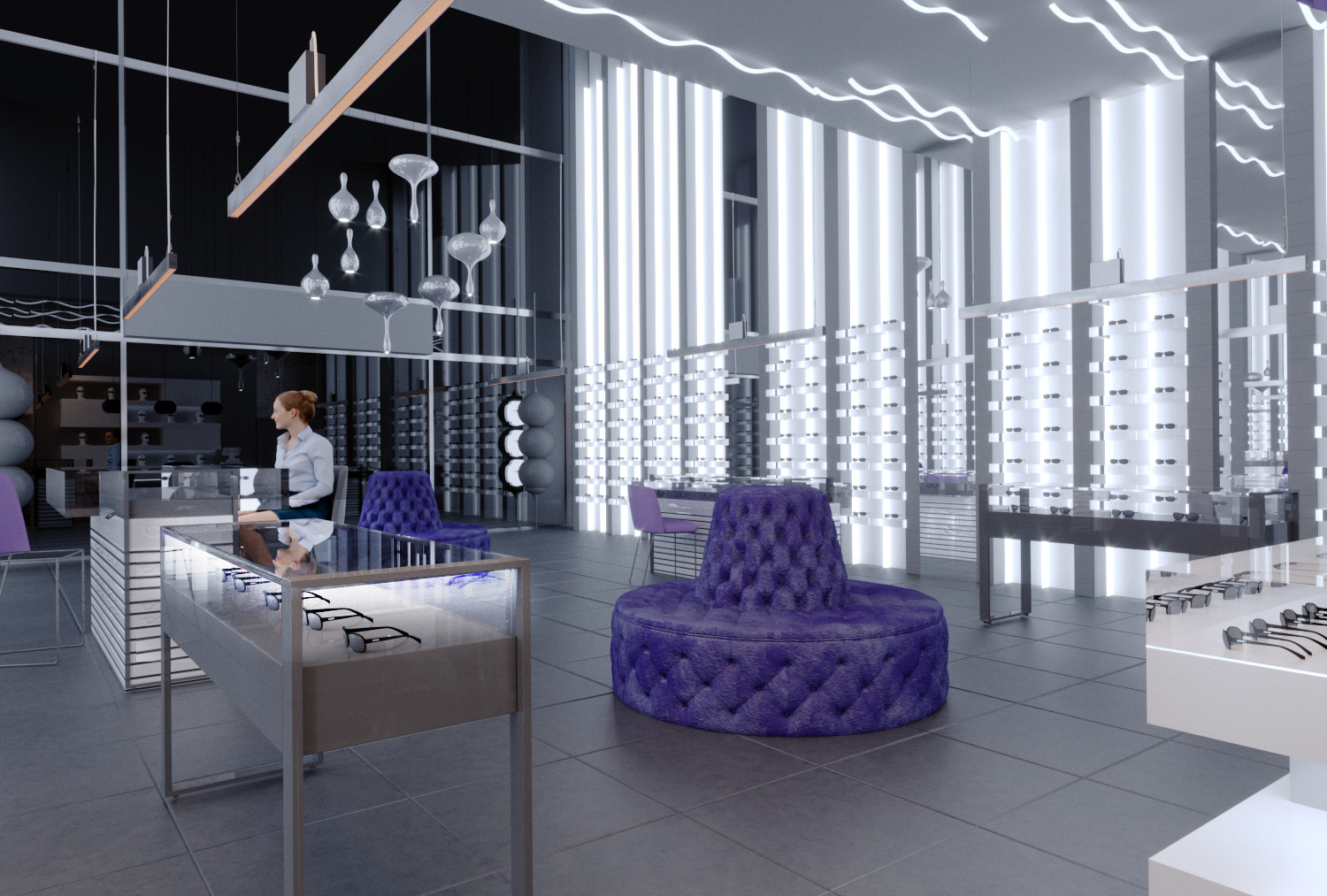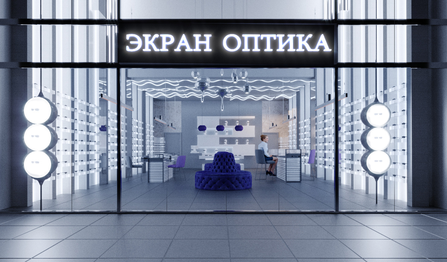 Один из салонов сети "Экран Оптика", выполнен в новом космическом жанре. Представляет собой пространство для путешествия вне временном жанре оптики, ведь очка как космос вечные, а формы их безграничны и многообразны.