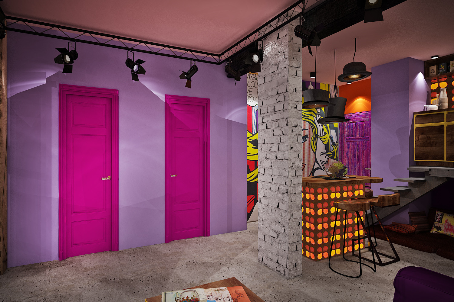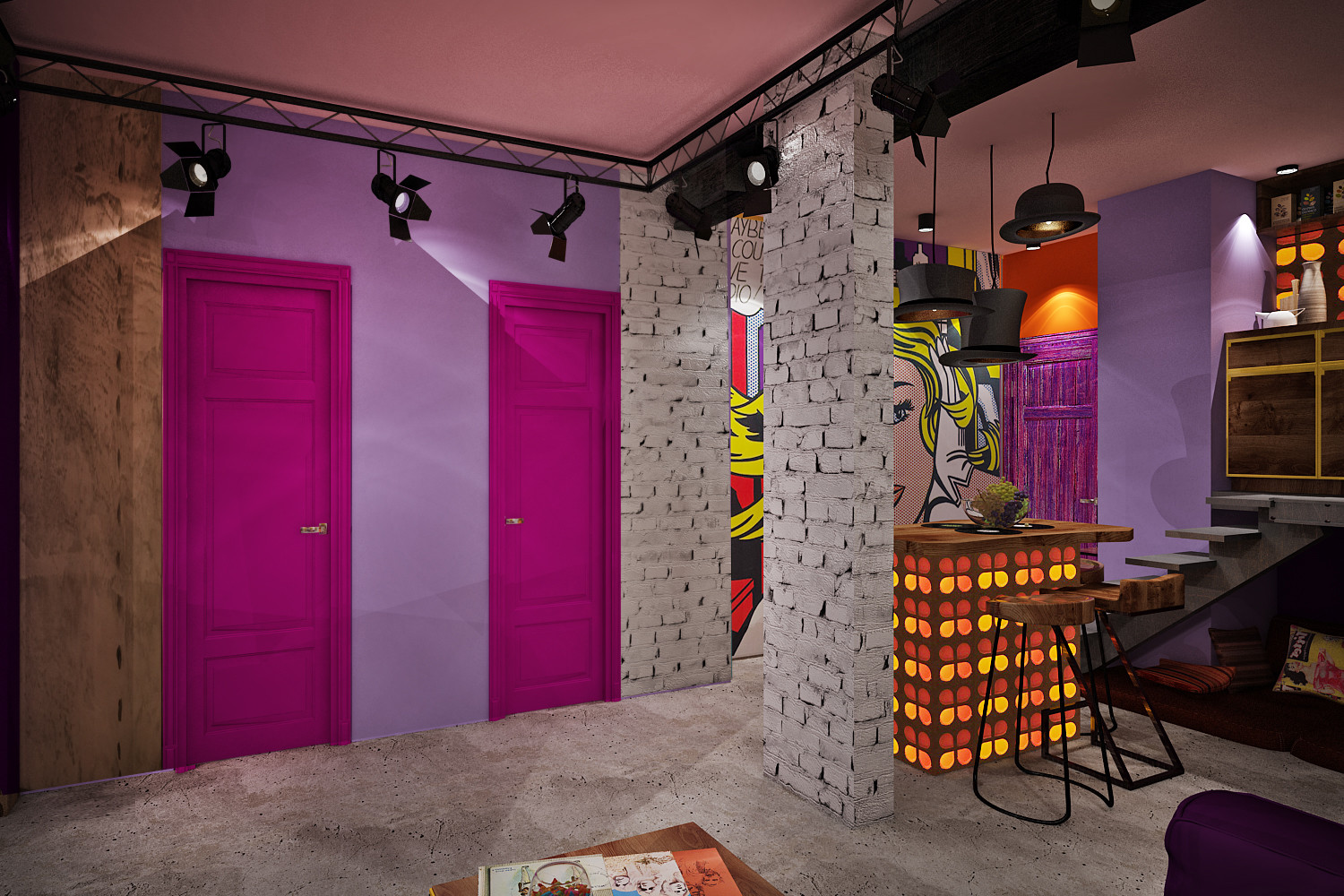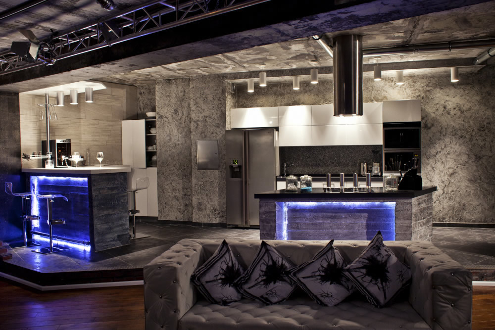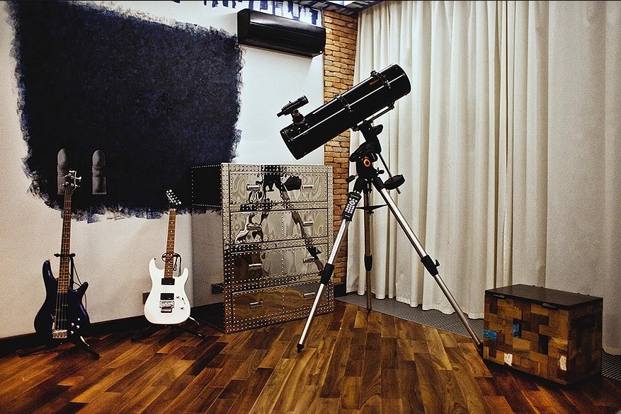 Штаб квартира звезды 65 м². Эта квартира - личная студия звукозаписи. Предназначена для работы, съемок и творческих тусовок. Возможен вариант проживания. Кровать трансформер находится под сценой. Перегородки при использовании, делают дальнюю часть квартиры приватной зоной.