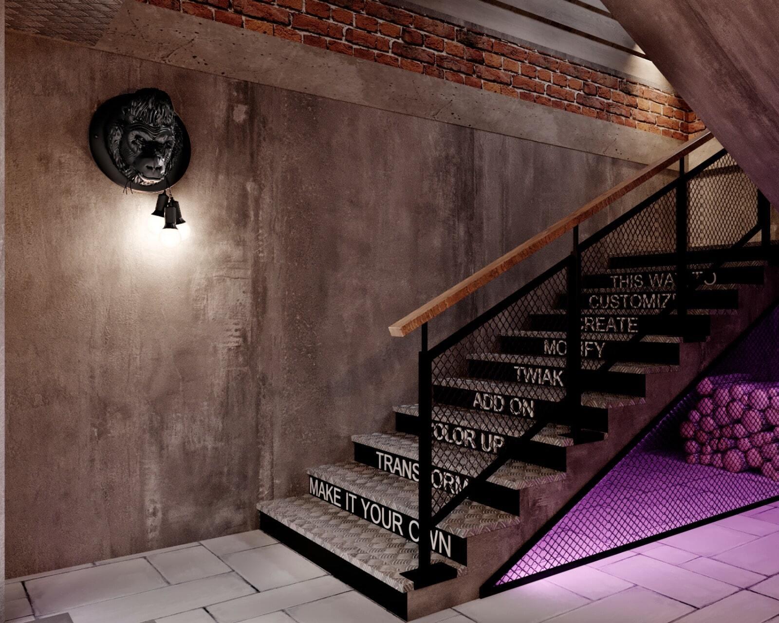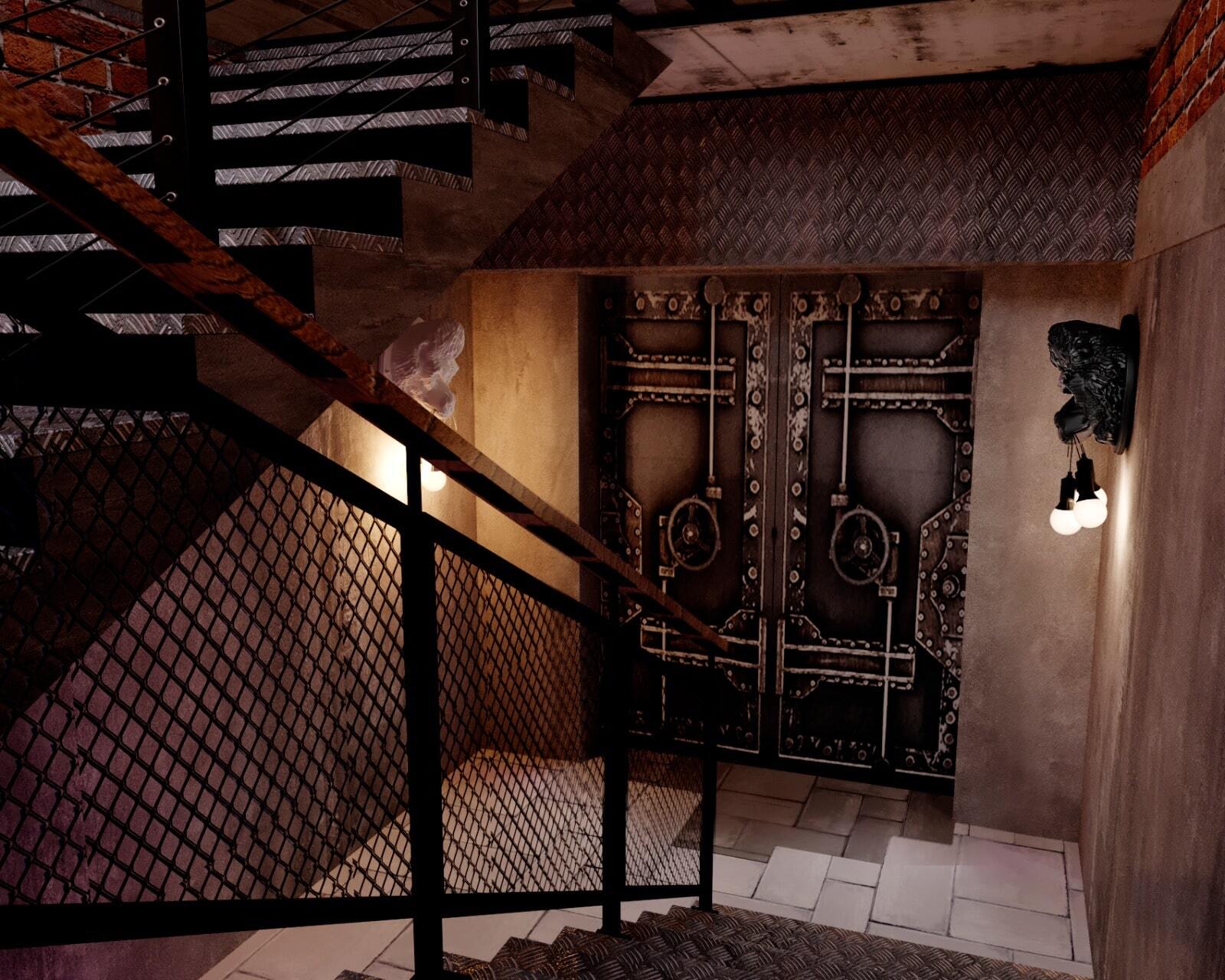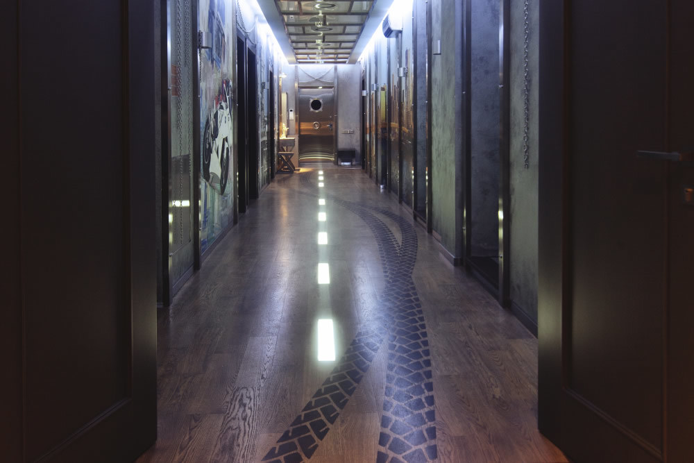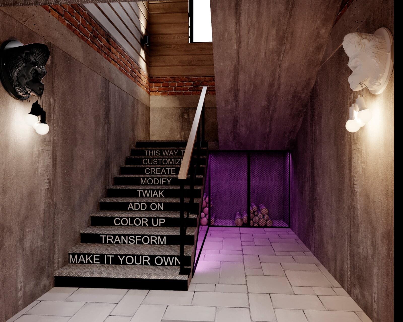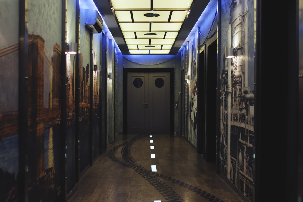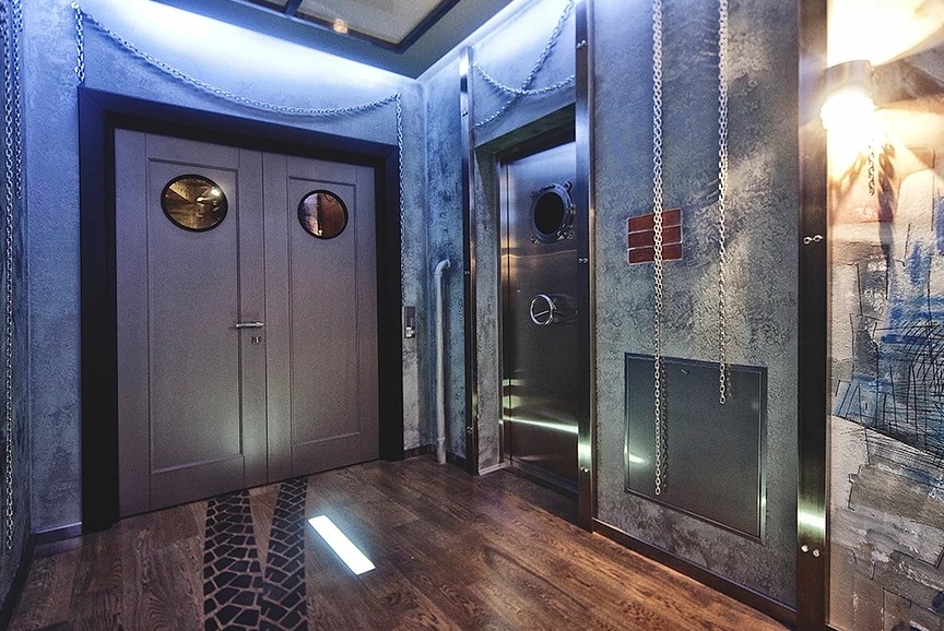 Зона отдыха расположенная на цокольном этаже гостевого дома сильно отличается по стилю от 1 и 2 этажа своими смелыми и необычными решениями. Попадая в подвал оказываешься в загадочной атмосфере. Каждая дверь хранит за собой неожиданный арт объект.