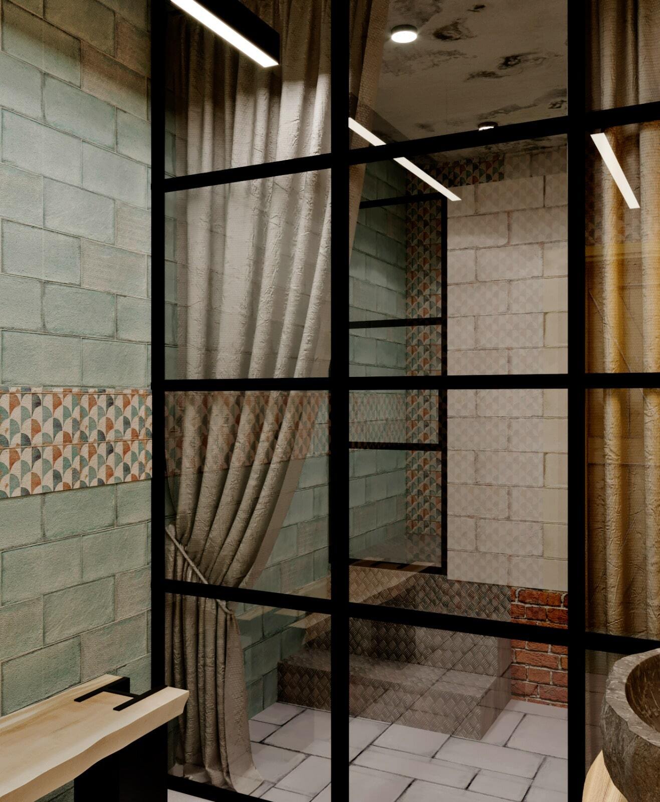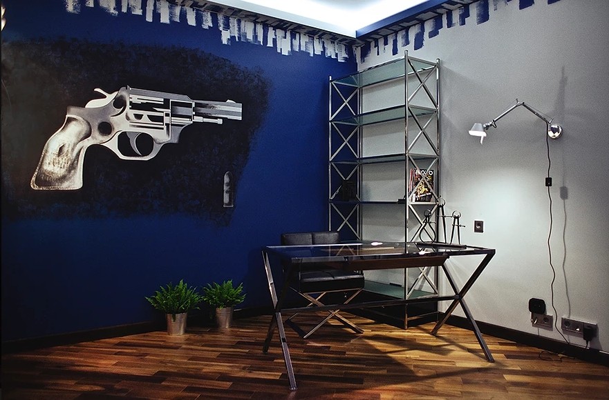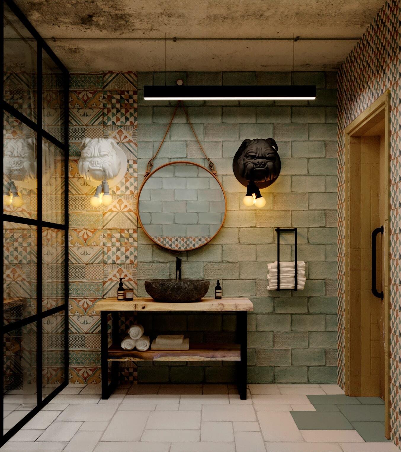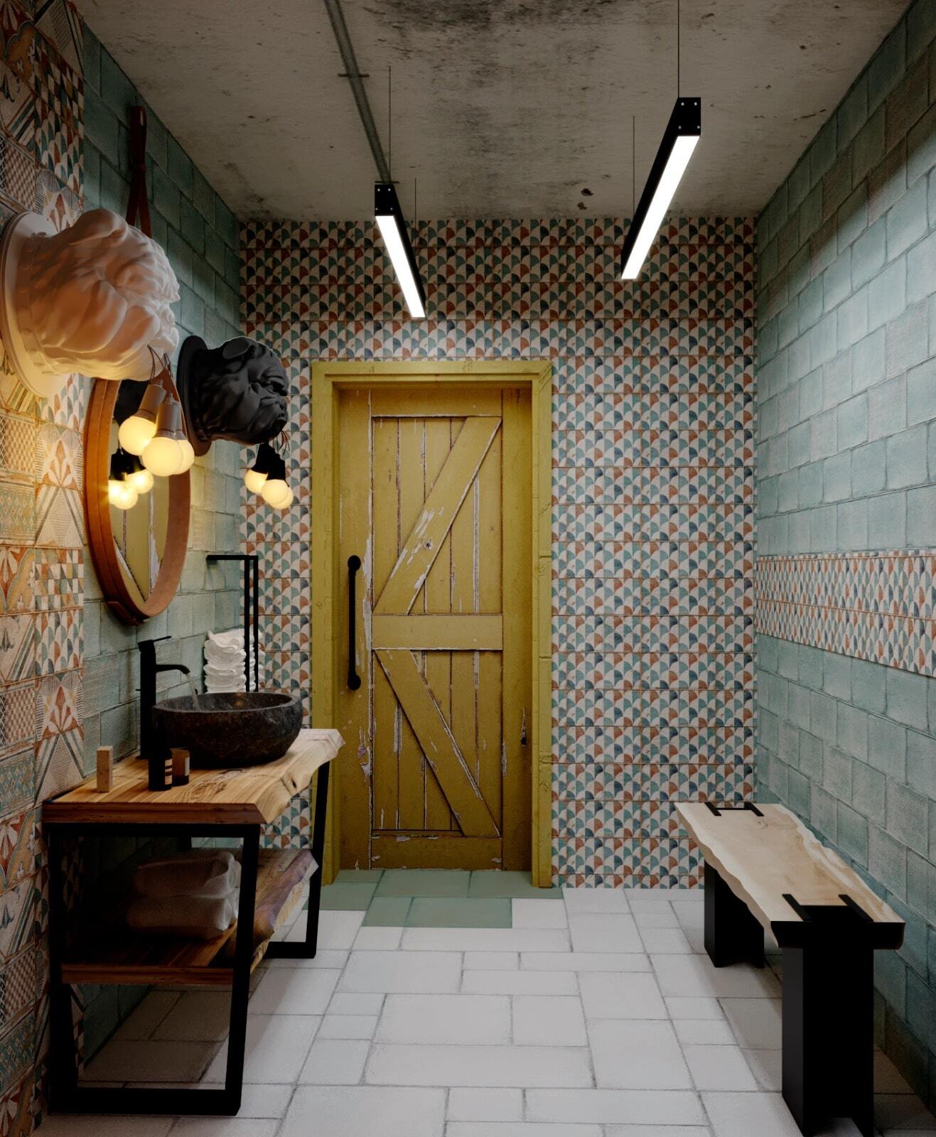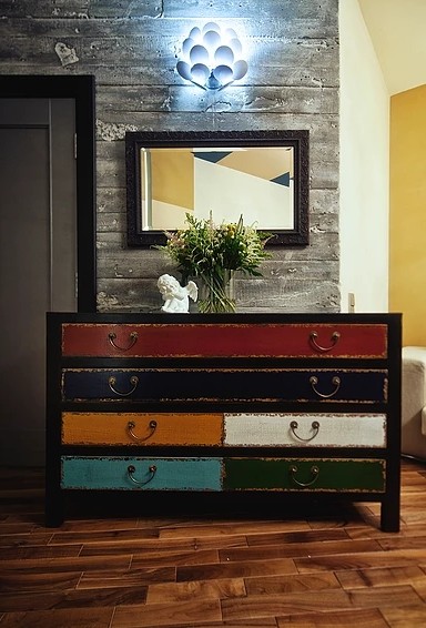 Зона отдыха расположенная на цокольном этаже гостевого дома сильно отличается по стилю от 1 и 2 этажа своими смелыми и необычными решениями. Попадая в подвал оказываешься в загадочной атмосфере. Каждая дверь хранит за собой неожиданный арт объект.