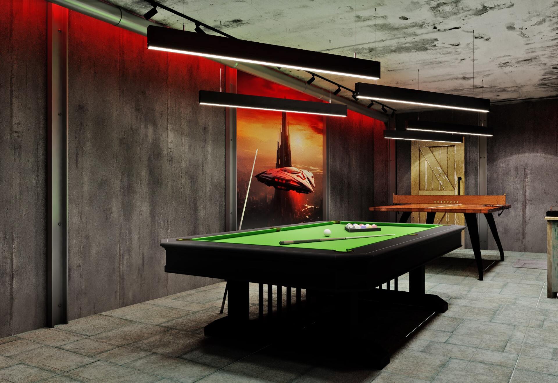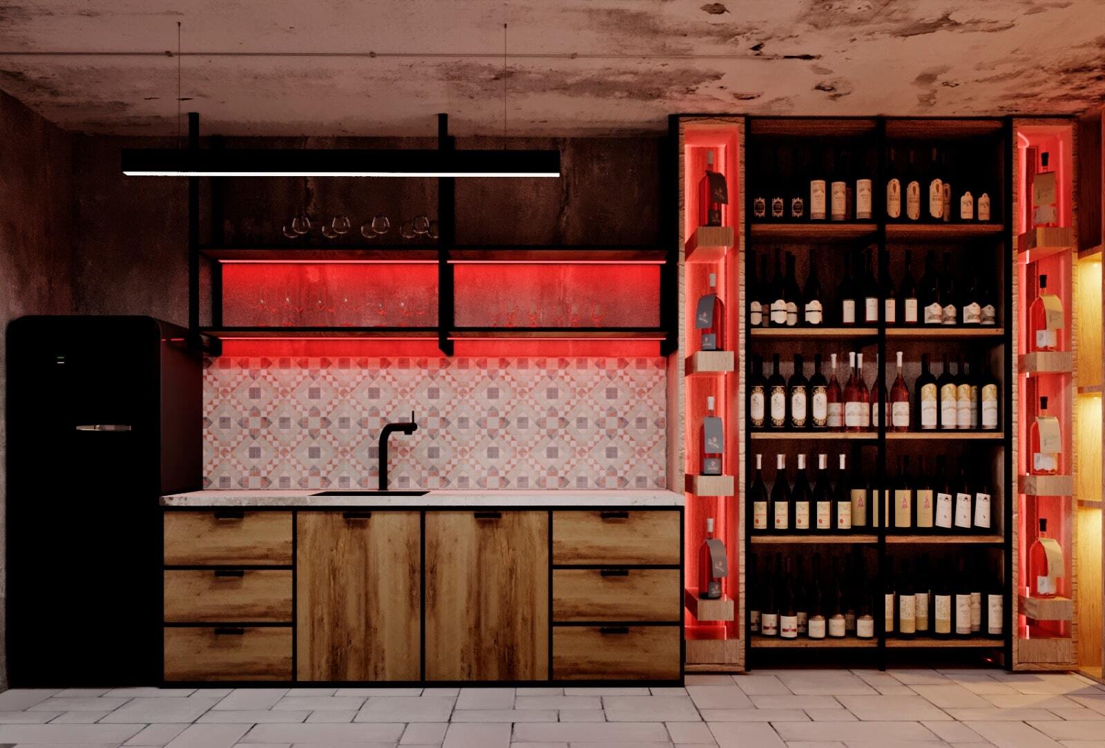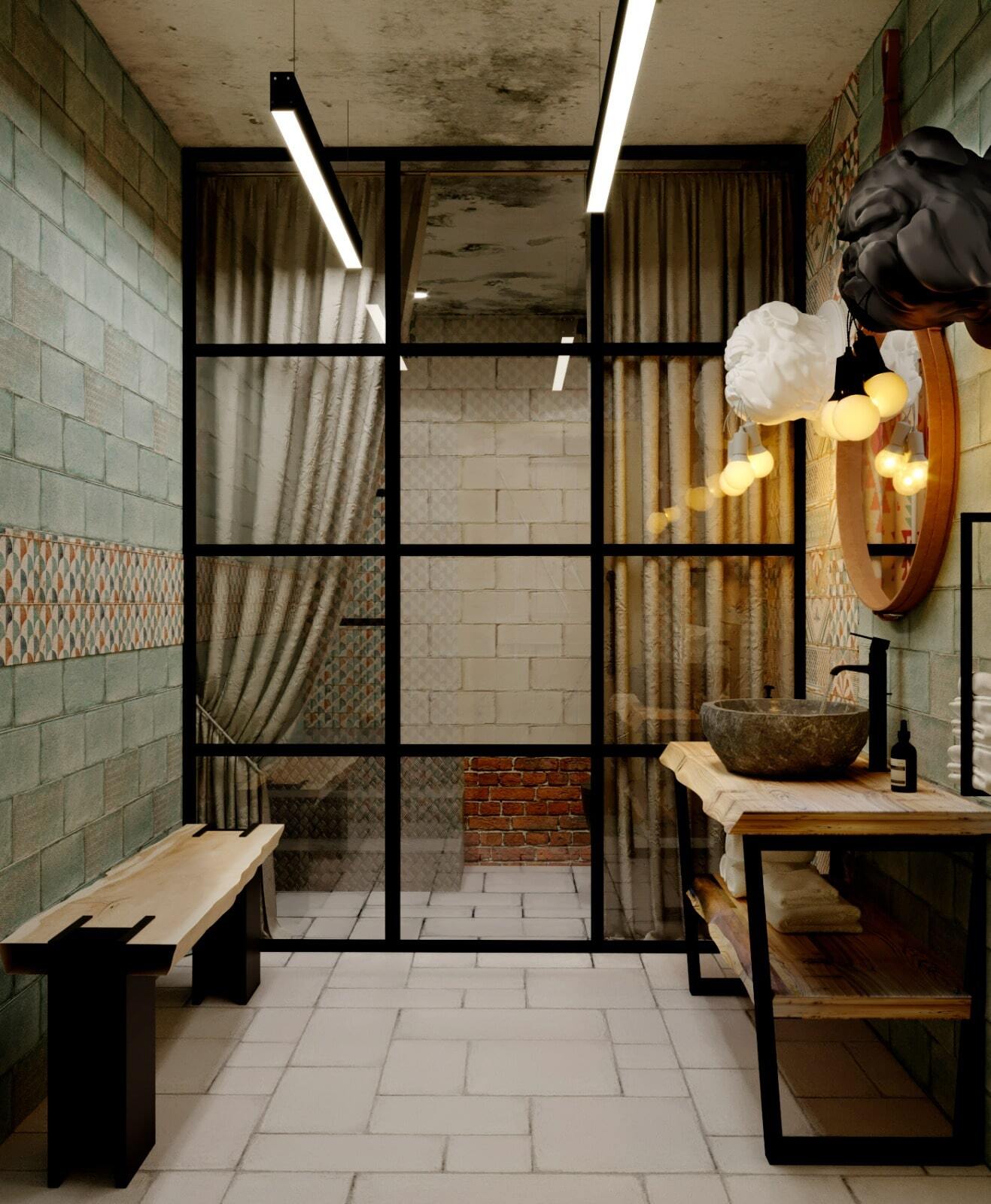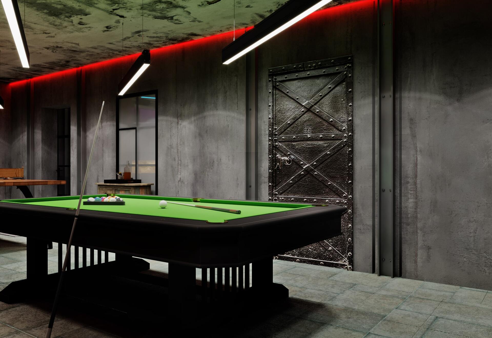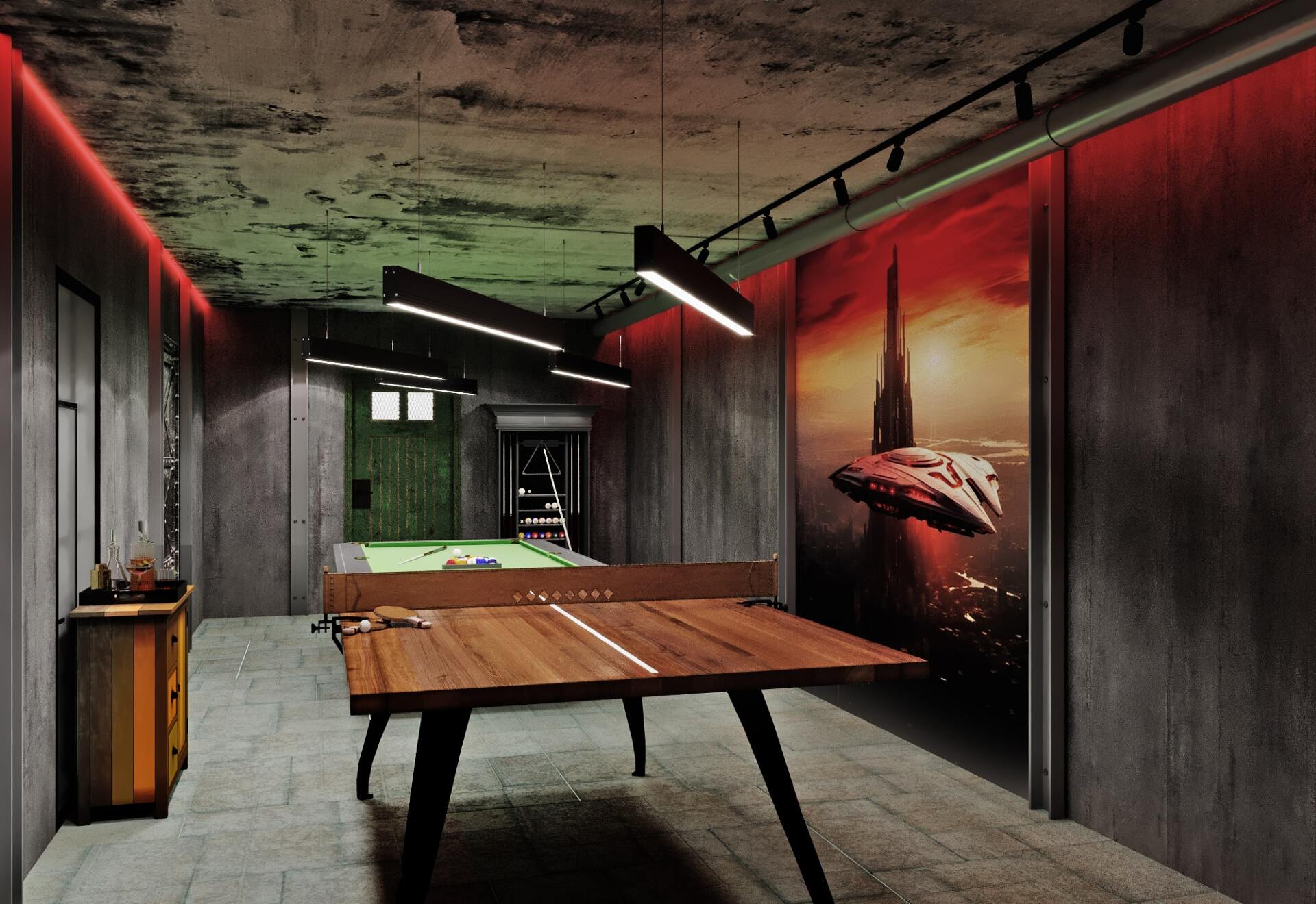 Зона отдыха расположенная на цокольном этаже гостевого дома сильно отличается по стилю от 1 и 2 этажа своими смелыми и необычными решениями. Попадая в подвал оказываешься в загадочной атмосфере. Каждая дверь хранит за собой неожиданный арт объект.