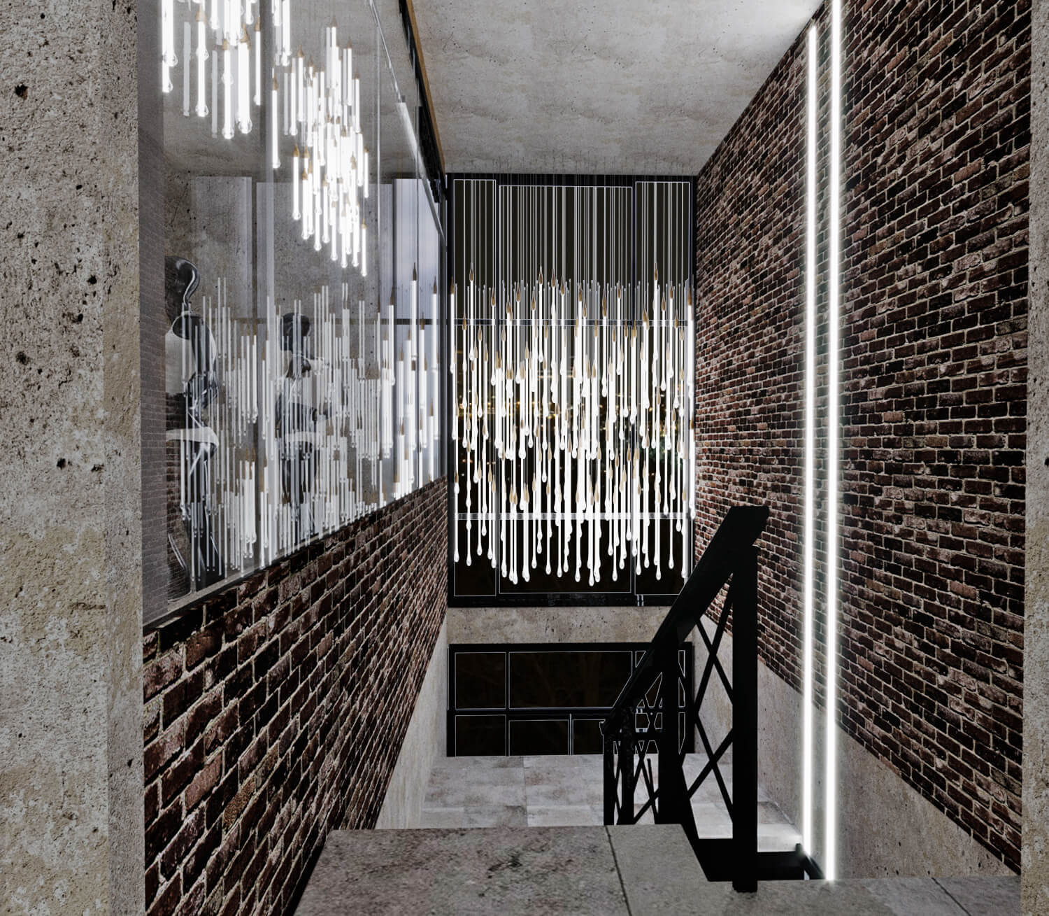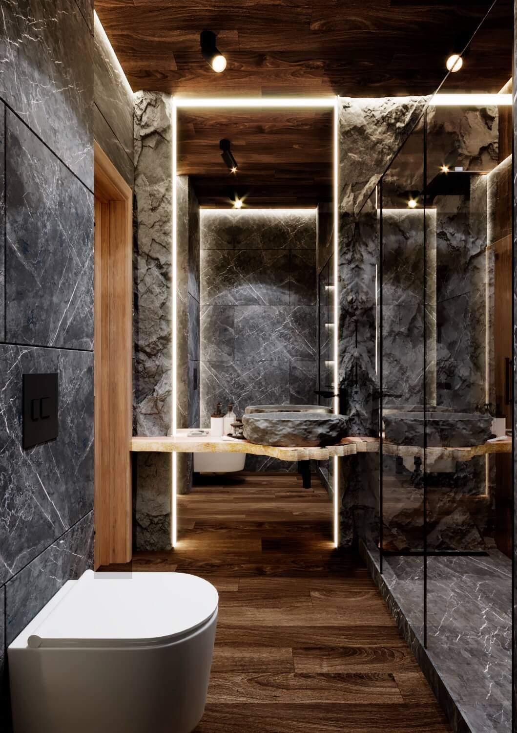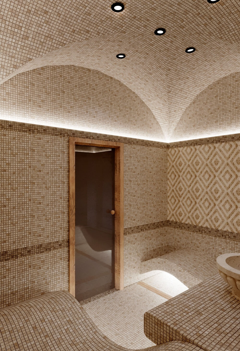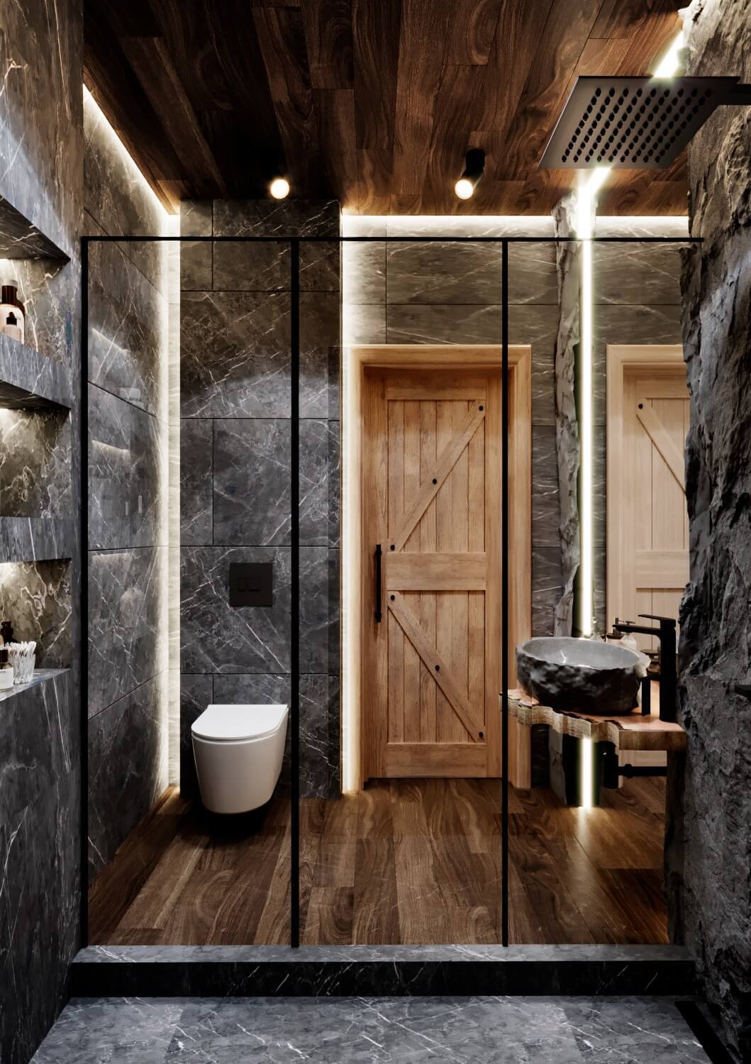 Зона отдыха расположенная на цокольном этаже гостевого дома сильно отличается по стилю от 1 и 2 этажа своими смелыми и необычными решениями. Попадая в подвал оказываешься в загадочной атмосфере. Каждая дверь хранит за собой неожиданный арт объект.