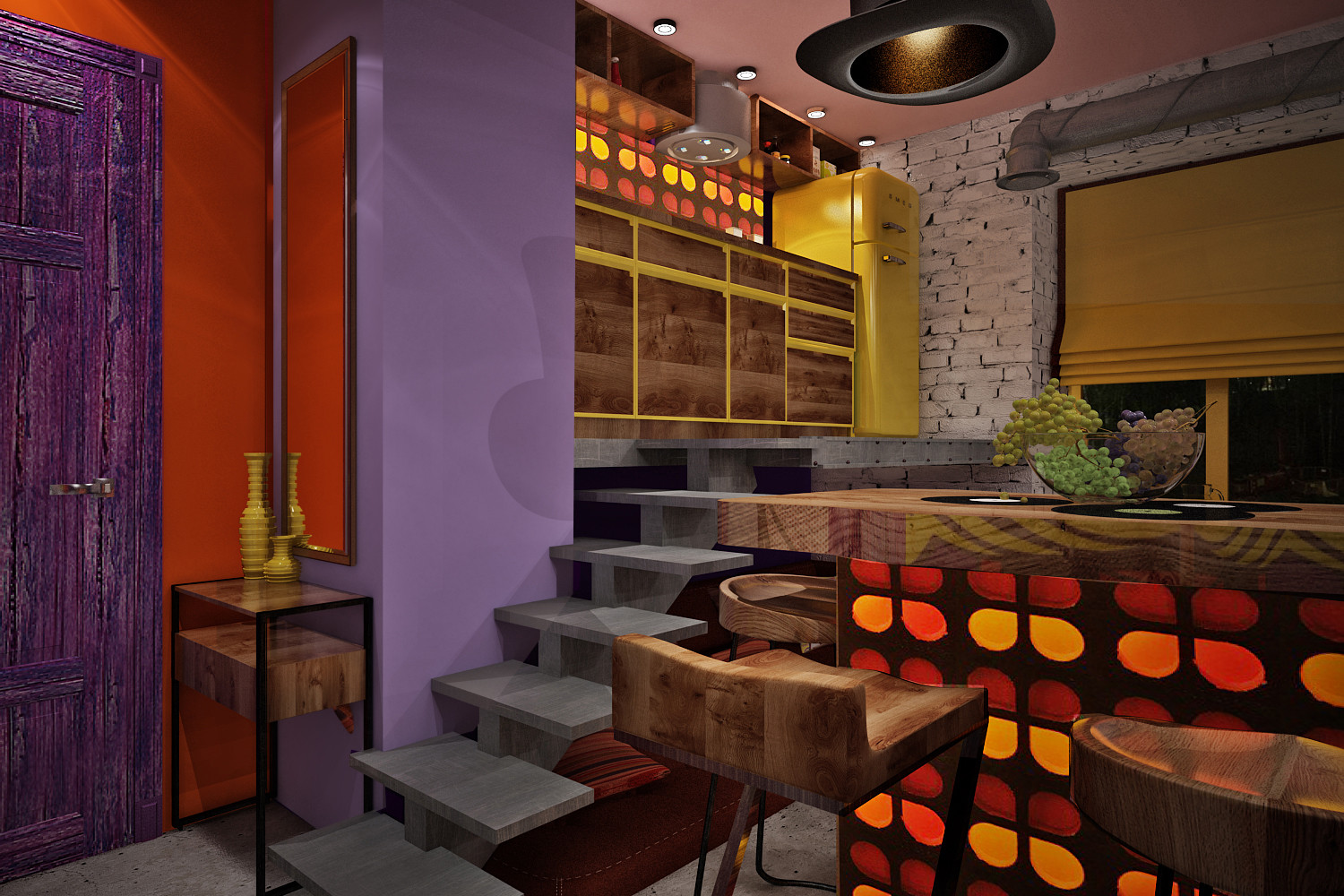Настоящая сталинка 1953 года, потолки 3100 мм. Жилье для творческой, неординарной личной. Дизайн подчеркивает ярко выраженное женское начало, не исключая при этом и мужские черты. Артистичная прихожая ведет в уютную спальню с фиолетовым пано, затем в декаденсную гостиную и наконец в выдержанную кухню с черным входом.